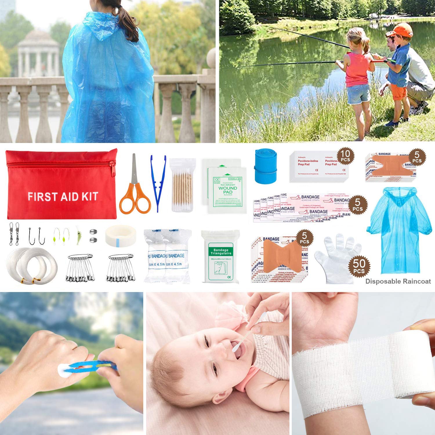 • [Basic First Aid Kit]: Comes with a first aid kit with bright red bag which includes essential items such as tweezers,bandages, would pad, bandage triangulaire, cotton buds etc. They can help stop the worsening of bleeding from minor injuries, mobilize injured limbs and even dress wounds to prevent infections.